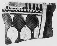 | Description: | Small fragment from rim and wall. Panel decorated with alternate glazed and reserved scales, veined with white and dilute glaze respectively. Upper border, tongues and dot. Glaze reddish and gray in places on the outside; good black within. Clay pinkish-buff. Cf. AJA 58 (1954), pp. 192, 194. | |