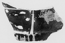 | Description: | Fragment preserves part of wall and lower body. The lower, horizontal border of the wall survives, with an olive spray in applied white; to the right of this, part of the glazed area around the handle. Below the shoulder, tongues. Clay, pinkish-buff; fired gray in places. | |