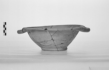 | Description: | Minor fragments of all elements missing. Narrow lip flat on top, sloping downward at outer edge. Horizontally placed handles immediately below lip, round in section, projecting slightly beyond edge of lip. Body incurves obliquely to low ring foot convex in profile. Coarse pink slightly micaceous clay with small grits; whitish slip with traces of dull black glaze on interior. | |