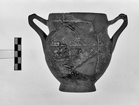 | Description: | Handles, half of lip and much of body missing; restored in plaster. Plain lip, slightly concave in profile terminating below in pronounced ridge. Ovoid body. Heavy ring foot with straight profile; groove around bottom. Ivy leaf thumb grip on non-joining fragment of handle. Soft orange clay, badly peeled glaze fired red except in a few patches. | |