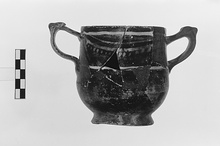 | Description: | One handle and much of wall missing; restored in plaster. Ivy leaf thumb grip. Necklace in applied white in band formed by two heavy grooves below lip. Body widest below middle. Plain, heavy, slightly spreading ring foot. Orange, slightly micaceous clay; black glaze shading to red. | |