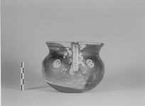 | Description: | A small piece missing from the rim and most of the bottom, but the profile nearly complete. Restored in plaster. Flat bottom, squat rounded body, wide mouth with outcurved rim. Glazed outside except for three reserved circles on each side, the central ones filled by a four-spoked wheel, those at the sides with glazed dots. Reserved dotted band on lip, and handles. Inside unglazed except for four bands inside rim. Pinkish-buff clay; glaze black to red-brown. | |