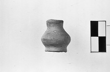 | Description: | Intact. Miniature closed pot; flat raised base, plump body, plain neck with slightly thickened rim. Light gray-buff clay, unglazed. | |