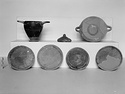 | Description: | Complete except for two chips. Similar to P 19869 (ΠΠ 617). ADDENDA P 19869: Flat floor with slightly raised rim, upper surface of which is flattened; exterior, slightly convex, sloping to broad flat bottom, left rough. Irregular wheelmarks everywhere visible; unglazed; warped. | |
