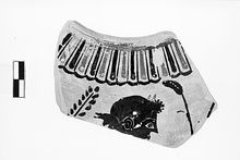 | Description: | From the neck of an amphora. Tongue pattern from base of neck, alternately red and black. On the shoulder, wreathed head, right; branch at left; at right, spear of wheat and oblique line close to break. Clay pinkish-buff; inside, traces of glaze at base of neck; wall unglazed. Red, mostly vanished, for the wreath. Incision for the wheat-ear. | |