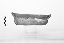 | Description: | Small fragments missing. Broad, slightly concave bottom, rounded walls; lip inset, flanged on interior for lid. Two handles attached at shoulder, touching lip and rising slightly above it. Hard gray clay. | |