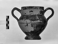 | Description: | Complete except for chips. Flaring ring foot, deep rounded body wall with groove at point of greatest diameter. High vertical rim, thickened at center. Band handles, rim to shoulder. Glaze fired unevenly, black to red on outside, somewhat peeled; inside, firm dark red. | |