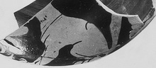 | Description: | About one-quarter preserved of a squat askos, with a trace of a raised edge the upper break. Flat bottom, reserved. On the top, a dog, seated left, towards a volute plant. | |