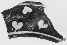 Description:   Rim fragment from a large plate, neatly moulded. Part of ring foot with flat resting surface reserved. On rim, between reserved bands, ivy wreath, the leaves reserved, the stems and berries white.