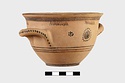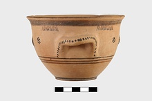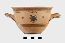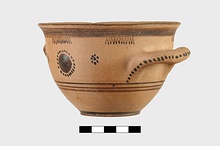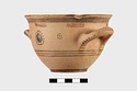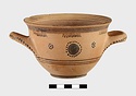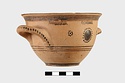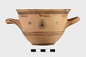 | Description: | Flat bottom, tiny plain foot, sides relatively steep curving gently out to plain rim. Body reserved; glaze band at foot; below handles, three glaze bands; below rim, wide glaze band. At center between handles front and back, glazed plastic wart surrounded by glaze dots; on either side, dot rosettes. Interior glazed but for reserved bands near rim, mid-body, and reserved circle on floor. On handles, dots. | |
