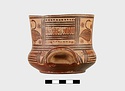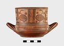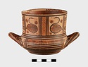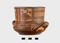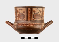 | Description: | Low ring foot; low, pronounced shoulder sloping up to high straight vertical rim; rolled handles, tilted upwards. On rim, front and back, two metopes, each containing plump goose with scored body. Above handles on rim, three zones of ornament. On shoulder zig-zag line in narrow panel, between triple band; glazed below. Between panels and handles, a dot rosette. Interior glazed, except for reserved band just inside lip. Glaze fired reddish. Fine workmanship and design. | |