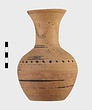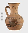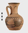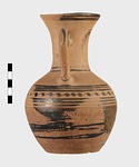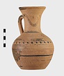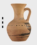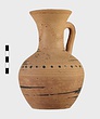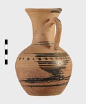| Description: | Flat bottom, globular body; neck flaring out to simple round mouth. Rolled handle mid-neck to shoulder. On neck, wavy line bordered by dots; in waves, dot rosettes. Shoulder reserved and undecorated. Below handle, zone of tangent dots; below, solid glaze. On handle wavy line. On lip and at base of neck, two glazed lines. Glaze fired greenish, metallic lustre; badly peeled. | |