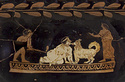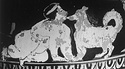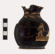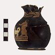 | Description: | Back of neck and handle missing; and scraps. Around the neck, olive wreath; ground line, egg and dot. The scene shows three children at play, with a dog; at left a nude boy, right, leaning forward, taking a stick to a small child crawling right to kiss a curly-tailed dog; at right, a boy wearing a himation, his right hand outstretched to the child. White for child and dot, with yellow drawing over; added clay for fillets. Firm black glaze; the resting surface and the space within the foot reserved. | |