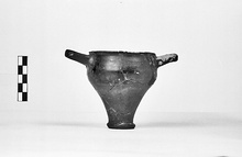 | Description: | Complete except for part of foot and fragment above. Deep skyphos elongated at the bottom; projecting rounded ring foot; the lip turned outward. Black glaze, somewhat metallic, over all. Cf. P 29197. | |