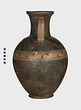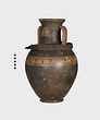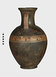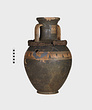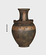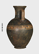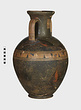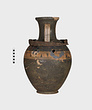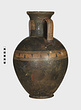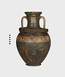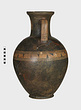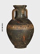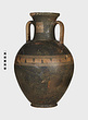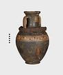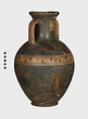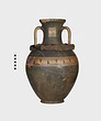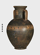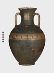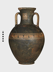| Description: | Cracked and broken in removal from grave. Complete but for chips. Heavy egg-shaped body, small flaring foot. Neck sharply offset from shoulder, slightly concave in profile, flaring up to deep thickened rim. Handles, neck to shoulder. Small reserved panel on neck containing segment of battlement maeander; above and below, zigzags. Belly stripe, opposed lines. Handles, herringbone; above and below, horizontal lines. Pinkish-buff clay. Glaze black, somewhat metallic. Iron stain on shoulder and one handle from sword wrapped around it (IL 1058). | |