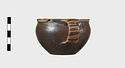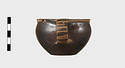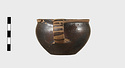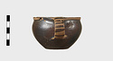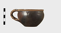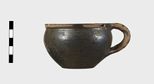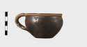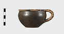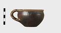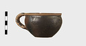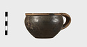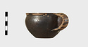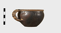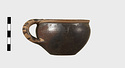 | Description: | Intact. Convex body, flat bottom, narrow offset rim. One handle, rim to body. Black glaze inside and out except for reserved stripe inside and outside of rim and underside of bottom. Handle, barred. Pinkish-buff clay. Glaze, black to dark brown, very metallic. | |