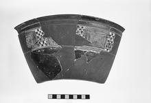 | Description: | Two non-joining sections of rim and upper wall, each mended from several. Lip flat, insloping; undercut inside, with row of head and reel in white and yellow. On outer wall, a broad band of alternating checkerboard and diminishing rectangles in yellow and white with scraped grooves above and below and a wavy white line underneath. Attic clay. Good black glaze; the grooves pink. | |