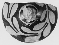 Description:   Type A. About two-thirds preserved; knob broken off. Top rises toward knob in shallow concave curve. Edge bevelled and inset, to fit over inset rim of pyxis. Laurel wreath on the top. On the underside, concentric bands and central dot. Black glaze on outer edge.