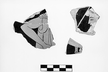 | Description: | a) Head of elderly man, left, his staff or scepter crossing the field close to his brow. Hair falling over forehead and temples, beard and moustache rendered in fine wavy lines of white; thin double fillet, purple. At left, Φ (Phoenix). b) Mended from two pieces. Standing youth, his right side preserved from neck to below waist, and the right arm with part of the handle. The right arm is drawn back sharply as if to thrust a weapon. The youth wears a thin short-sleeved chiton and a chlamys fastened around his neck. Very light dilute glaze for the folds of the chiton. c) Preserves a trace of the start of the rim. Lustrous black glaze, inside; careful relief contour. Possibly some scene between Theseus and Aegeus? | |
