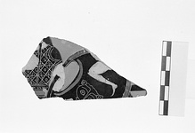 | Description: | Wall fragment depicts the left side of the torso and waist, the base of the neck, and the lower parts of the hair of female figure. Her left arm is seen through the interstices of the side of the Boeotian shield of the man to her left. Only a bit of his arm is visible. Devices on the shield: full face panther's head; on either side, a female leg(?). Although only a tiny part of the lower device remains, we would expect the upper and lower designs to balance each other. Excellent black glaze inside and out. Red used to border the shield and to decorate the belt of the woman; white for the flesh of the woman and for the legs on the shield. Fine incisions on the panther's head and the elaborate chiton of the woman. Red line around the interior and interstice of shield. ADDENDA The woman may be holding the shield. | |