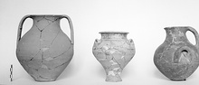 | Description: | Part of lip and neck and minor fragments of body missing; restored in plaster. Flat bottom; ovoid body; two flat vertical handles attached to lip and shoulder. Dark pinkish-buff clay with small grits. Unglazed. | |