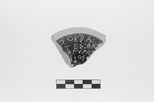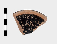 Complete ostrakon. Incised underneath: Σοκρά/τες: Αν/αγυρά/σιος