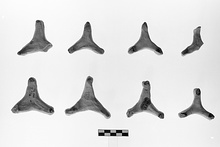 | Description: | Triangular object. Tips raised above flattened center. Grayish-buff clay, unglazed. | |