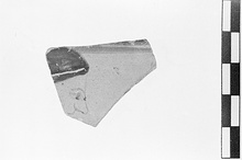 | Description: | A small bit from near the top of the panel of the side of a thin-walled closed vase. The forepart of a head to the right, the face reserved in outline, with the iris of the eye, and the hair solid. The fillet is incised; the other outlines in light brown glaze. Above, a dilute and a red line indicate the top of the panel. Light reddish-buff clay; brown to reddish-brown glaze; the interior unglazed. | |