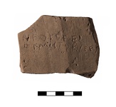 | Description: | Wall fragment of large semi-glazed krater; red glaze, peeled, inside; trace of red band outside. Inscribed outside: <graphic> | |