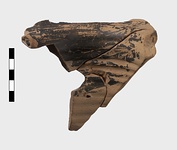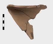 | Description: | Roughly triangular fragment from neck and upper shoulder of large closed pot, probably an amphora. Circular hole, 0.02 in diam., cut into neck at about mid-height (nearly half of circumference missing). Pinkish-buff clay. Dull black glaze irregularly applied on interior only, running onto breaks on both sides and into hole. ADDENDA Agora Sample no. 860. | |