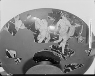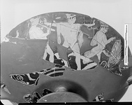 | Description: | Joins P 19126. Fragment of a red figure kylix mended from five pieces. Outside: Komos. Two youths to right; both have loose himatia, the left one a stick. Head, neck, shoulders, arms, feet of first youth missing; from the second youth only the left arm, part of body with tiny part of himation and end of stick are preserved. Inside: part of the maeander-and -squares band of the medallion is preserved. Partial relief contour. | |
