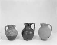 | Description: | Complete save for chips from trefoil lip and base. Rather angular profile. Ring base. A reserved band extends from bottom of neck to below point of greatest circumference, which is marked by a band of glaze. In the reserved area above this is a curving ivy vine with leaves, tendrils and berries. One side blackened from burning. Pinkish buff clay, very micaceous. The thin glaze wash, red with some mottling of black, covers the lower part of the pot, the neck, inside and out, and the outside of the handle. | |
