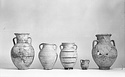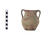 | Description: | Mended from many pieces. One handle, fragments from rim and side walls and chips missing. Flat bottom; full body; no neck; wide mouth; handles from rim to shoulder; rim on one side pinched to form shallow open spout. Pairs of bands on body; handle barred. Surface mostly lost. Glaze decoration was red-brown. | |