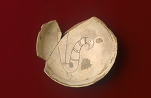 Pinkish clay, slipped with white. Inside on floor, sgraffito bird; outside, zigzag in sgraffito and in green to brown glaze.