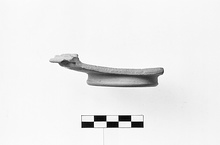 | Description: | Complete profile preserved; most of rim and wall missing. Steep rim profile; rim grooved in different levels; ring foot. Buff clay. Thin wash of black glaze mostly worn on interior. | |
