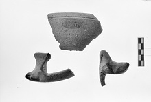 Description:   Two lugs (fragments a and b) and one fragment (c) from wall. The rim of the fire bowl is plain and incurved; the lugs have small and simple projections upward and inward.