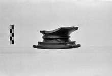 | Description: | Two fragments from a large black glazed base for an open bowl. The base flaring and heavily moulded. Metallic black glaze overall; a scraped line below the middle moulded ridge. | |