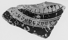 Description:   Fragment from near center. On the top, end of rays radiating from the center preserved and around them a band with dotted egg. Tiny piece of representation preserved near the break at outer edge: relief lines and contour band. On underside part of a whirling rosette; the leaves alternately black and reserved; the outlines incised.
