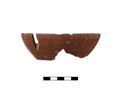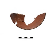 | Description: | Five joining fragments preserve about one-third of rim and bit of bottom. Flat-bottomed shallow bowl with flaring side and plain rim. Incised circle on floor. Cinnamon-brown micaceous clay. Orange-red glaze on inside, duller red on outside. Samian. Fragment from somewhat similar bowl from same group stored in Tin 238. | |