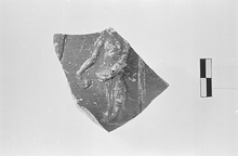 | Description: | Wall fragment from a sizable Pergamene bowl. Decoration in low relief; a figure standing right, holding two objects. | |
