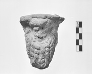 | Description: | Plastic attachment from situla. Apparently complete as attached to vase; the surface somewhat chipped and damaged. The head, wreathed, with a bunch of grapes hanging down on either side(?) is set immediately below the narrow flat pot rim. The long beard is arranged in eight curls. Coarse red clay covered with a purplish red wash. | |