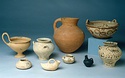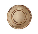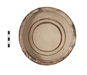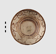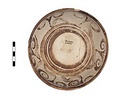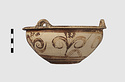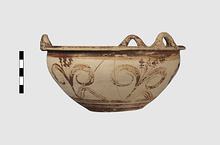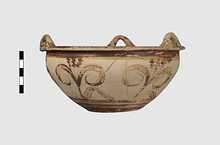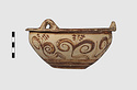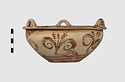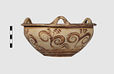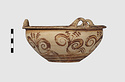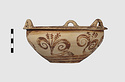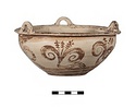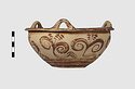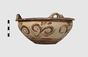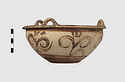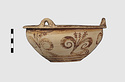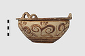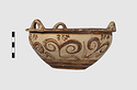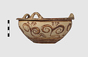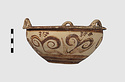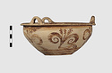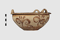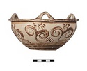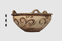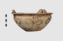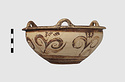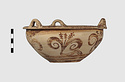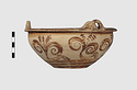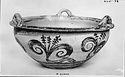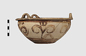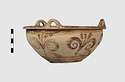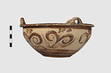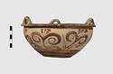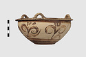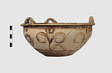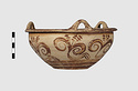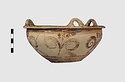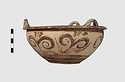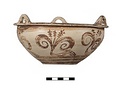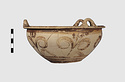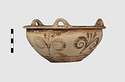 Description:   Bowl with Ring Handles. Mended from eight pieces. Small chips. Out-turned rim; three horizontal handles on it. Flat bottom. Cream slip. Rim and handles painted brown. Inside; two concentric circles at the lower part. Outside: six lilies (two petals, three stamens) around the bowl; below three bands.