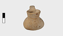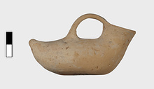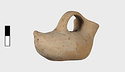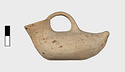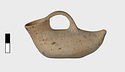 | Description: | Intact; surface damaged. Elongated, tailed, flat below. Wide spout; flat handle from lip to about the middle of the body. Cream slip. Most of painted decoration gone. Rim and handle once painted. Running dog pattern runs on the upper part, from the tail, around the base of the spout and back again. Band around the elliptical bottom. | |