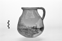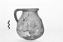 | Description: | Large fragments missing from body and rim. Twisted handle. Gritty brown clay, blackened from use. ADDENDA Found broken [December 1956]. Restored in plaster [May 1958]. | |