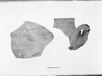 | Description: | Several joining fragments preserve part of rim and wall with one handle. Deep bowl; vertical rim. Interior glazed; the edge of the rim reserved. Outside, the rim banded; the wall, so far as preserved, reserved to below the handle; then three narrow bands, and black below; a single band on the handle, and tails beside. Black glaze, badly worn. | |