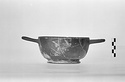 | Description: | Mended from many pieces; large piece from the wall including halves of both handles missing. Restored in plaster. Inside, around the center, small linked palmettes. Outside, two grooves at the rim; one scraped on the lower part of the wall at the point where tapering begins; thin foot with curving under-surface. Glazed beneath, with a broad reserved band around a central disc; the glazed areas marked off by five scraped lines, one near the outer edge and a pair further in, one at either edge of the reserved band, and a small pair at the center. Glaze firm black outside; streaked and greenish inside; worn on the handles. Red wash beneath. Very careful work. | |