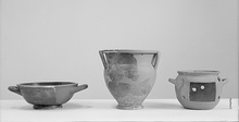 | Description: | Mended from many pieces; large part of side with one handle missing; chipped, especially at edges of joining fragments. Complete profile. Restored in plaster. Rim flattish above; thick high ring foot with flat resting surface; slightly convex bottom. Handles round in section. Glazed over all except resting surface, inside the handles and handle space. Thick glaze, not carefully applied, and the surface not well finished before glazing. Pinkish-buff clay. | |