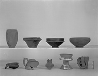 | Description: | Two joining fragments give some of rim and body. Vertical offset rim, grooved outside; bulging upper part with two grooves and light rouletting below them. Gray clay and dull gray glaze wash. | |