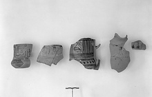 | Description: | Three fragments, the larger giving part of rim to lower body; a non-joining fragment has spring of double rolled handle. Rim black, a panel in front, with two horses to left and filling ornaments; lower, horizontal stripes and a band of S-squiggles; handle black inside. Pinkish-buff clay. Dull black glaze, very much worn. | |