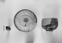 | Description: | Fragments of rim missing. Mended from six pieces. Decoration in blue-gray: lines around rim from which hang groups of dots; in center a floral design. Light buff clay, grayish white glaze. | |